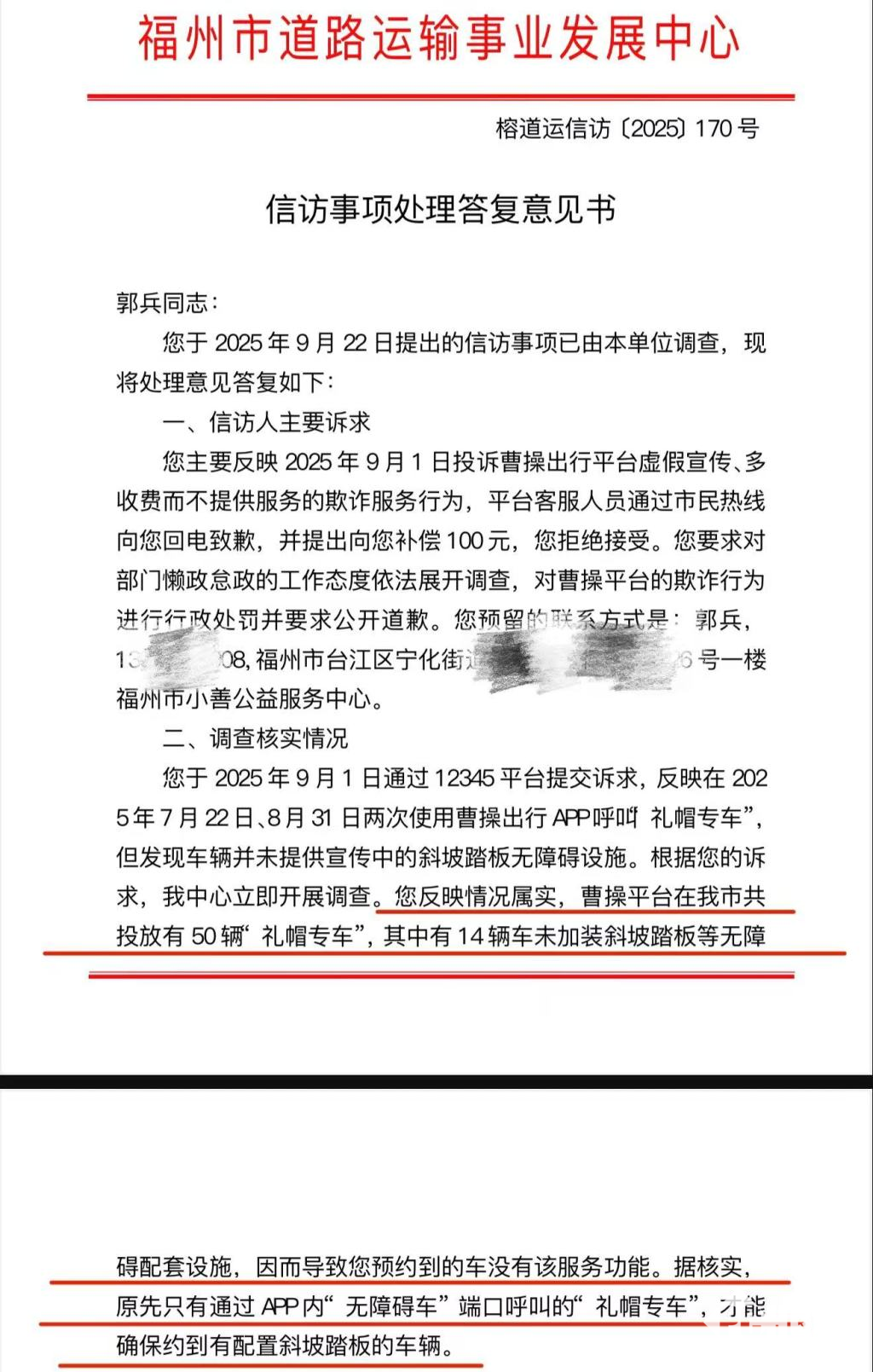 今年11月14日,福州市相关部门调查核实情况,曹操平台在福州市投放50辆“礼帽专车”,其中14辆车未加装斜坡踏板等无障碍配套设施,责令限期整改。11月26日,该消费者反映,在实际体验中,“礼帽专车”仍存在未配备“抽拉式斜坡踏板”,部分需要从后备厢取出的拼接式金属板,但这种拼接板和车身之间没有任何锁扣固定,直接搭靠在车身上,存在一定安全隐患。针对情况,礼帽专车客服回应,只有通过“无障碍车”专属端口呼叫的“礼帽”专车,才能确保配备斜坡踏板,若有使用斜坡踏板的需求,建议下单后提前联系司机确认。