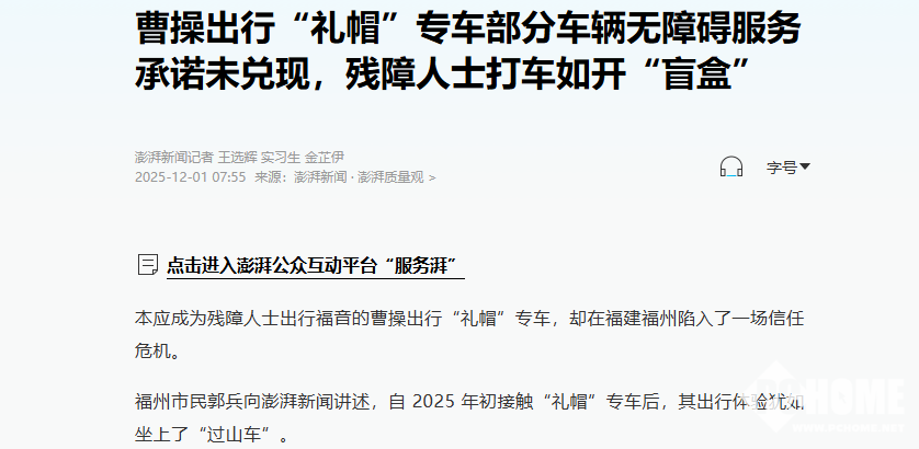 2025年12月1日消息,有消费者反映,提供无障碍专车服务的“礼帽专车”,被指存在“名不副实”“服务缩水”的情况。在福建福州,由“曹操出行”平台投放的50辆“礼帽专车”,其中14辆车未加装斜坡踏板等无障碍配套设施,曹操出行的“礼帽专车”收费高于普通车型,却未兑现宣传中的无障碍设施及服务承诺。
