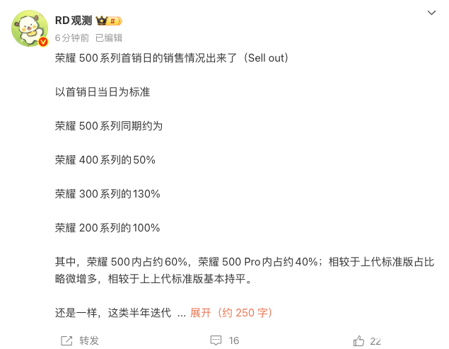 2025年12月1日,数码博主“RD观测”披露了荣耀500系列手机首销日的销售情况,表现不及前代。