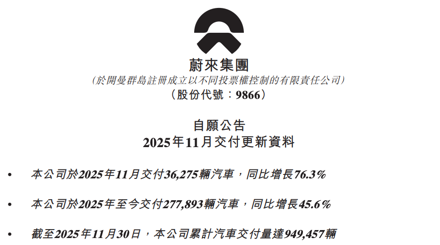 2025年12月1日,蔚来汽车发布2025年11月交付数据,当月共交付汽车36275辆,同比大幅增长76.3%。