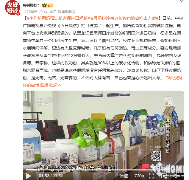 据《今日说法》节目介绍,在电商平台上,卖家强调的从黑龙江省黑河口岸发货的所谓国外进口奶粉,其实很多是在河南省中牟县一个出租房中生产的“假奶粉”。经过专业机构鉴定,假奶粉含有大量麦芽糊精,几乎没有任何脂肪、蛋白质等成分。
