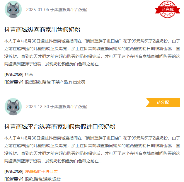 据黑猫投诉平台显示,有不少网友反映,在淘宝平台、抖音直播购买到美可卓蓝胖子“假奶粉”,奶粉跟之前在超市买的正品相比,不仅味道怪,口感也没有奶味。经过查询发现,奶粉包装没有国家认证的中文标识以及相关许可信息。中国政法大学曲新久教授表示,电商平台方对商户有监管责任,网上购买奶粉,需注意价格以及快递单发货地址,是否和网上物流信息一致。