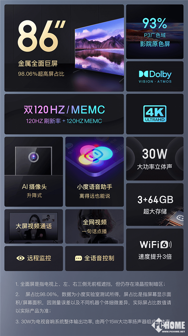 据介绍,小度智能巨屏电视V86采用93% P3广色域影院原色大屏,分辨率为3840*2160,拥有98.06%超高屏占比,支持120Hz高刷新率,搭配MEMC专业毫秒级插帧算法,低帧率视频也能提升至120帧播放。