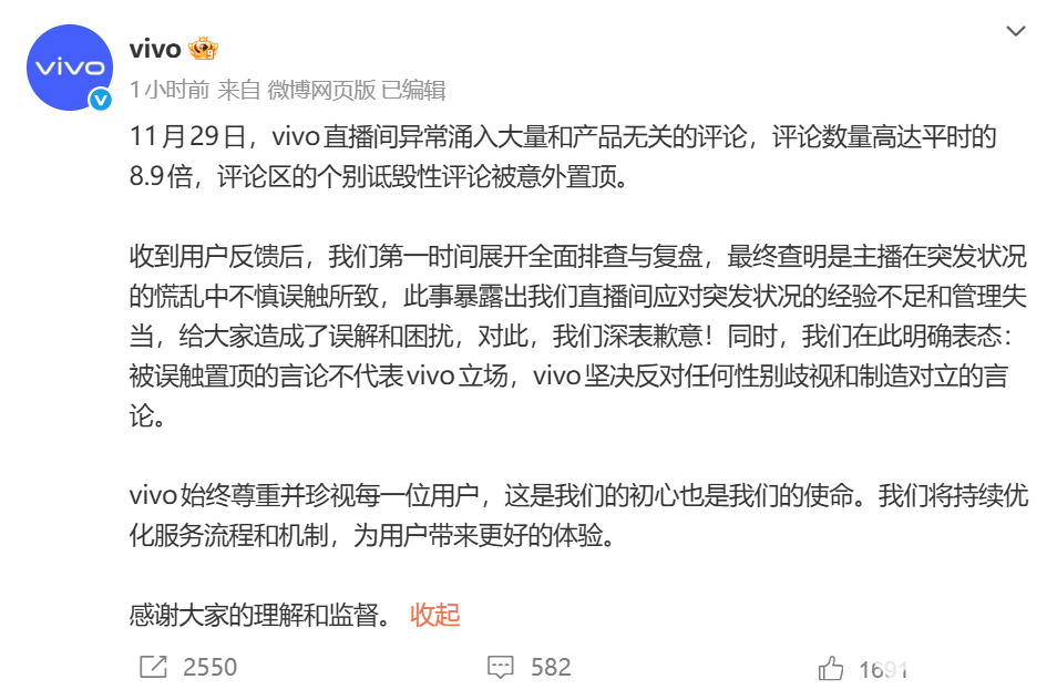 12月1日,vivo就官方直播间出现性别歧视评论被置顶事件作出正式回应,明确表示系运营人员误触导致个别诋毁性评论置顶,公司坚决反对任何形式的性别歧视和制造对立言论,已启动内部核查并向用户致歉。