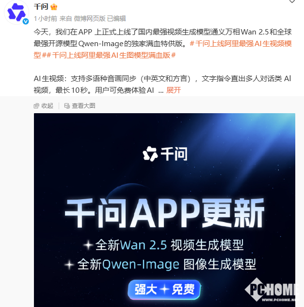 2025年12月2日消息,千问官方宣布,千问APP正式上线了国内最强视频生成模型通义万相Wan 2.5和全球最强开源模型Qwen-Image的独家满血特供版,并且新上线的两款模型提供免费体验。