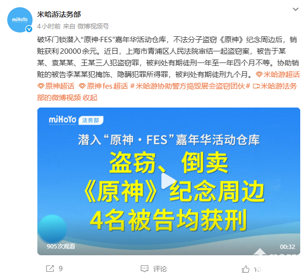 2025年12月2日,米哈游法务部官方微博发布博文称,破坏门锁潜入“原神·FES”嘉年华活动仓库,不法分子盗窃《原神》纪念周边后,销赃获利20000余元。