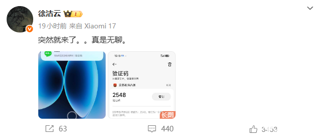 2025年12月3日消息,于12月2日,小米集团战略市场部副总经理徐洁云、汽车副总裁李肖爽等多名高管在微博发文表示,遭到了短信轰炸,数分钟内收到了数十条验证码短信。