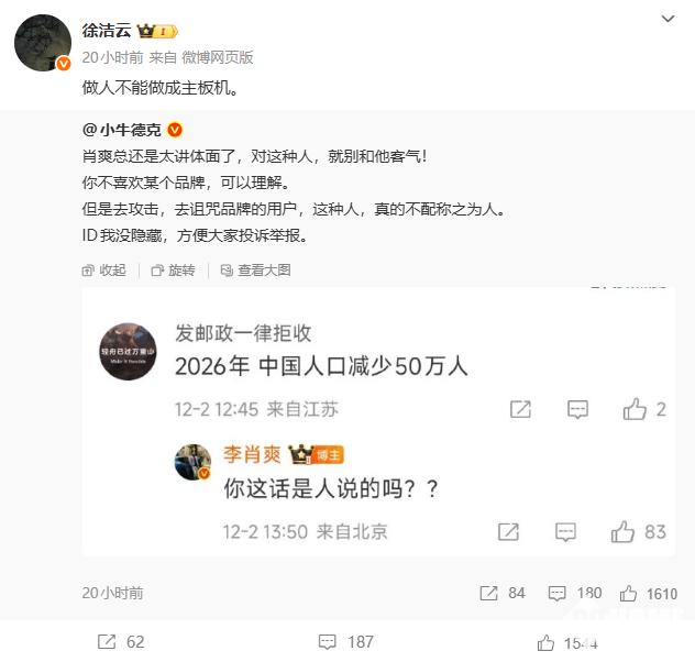此前,李肖爽曾公开回应用户“发邮政一律拒收”,该用户因发表诅咒小米“2026年中国人口减少50万车主”的言论而遭封禁,徐洁云表示“做人不能做成主机板”,有网友猜测,该短信轰炸事件为此用户所为。值得注意的是,该用户的头像印有“轻舟已过万重山”文字。