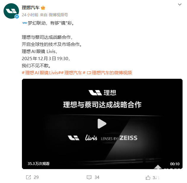 2025年12月3日消息,理想汽车与蔡司正达成战略合作,开启全球性的技术及市场合作,并宣布,理想AI眼镜Livis于今日下午19:30开启发布会。