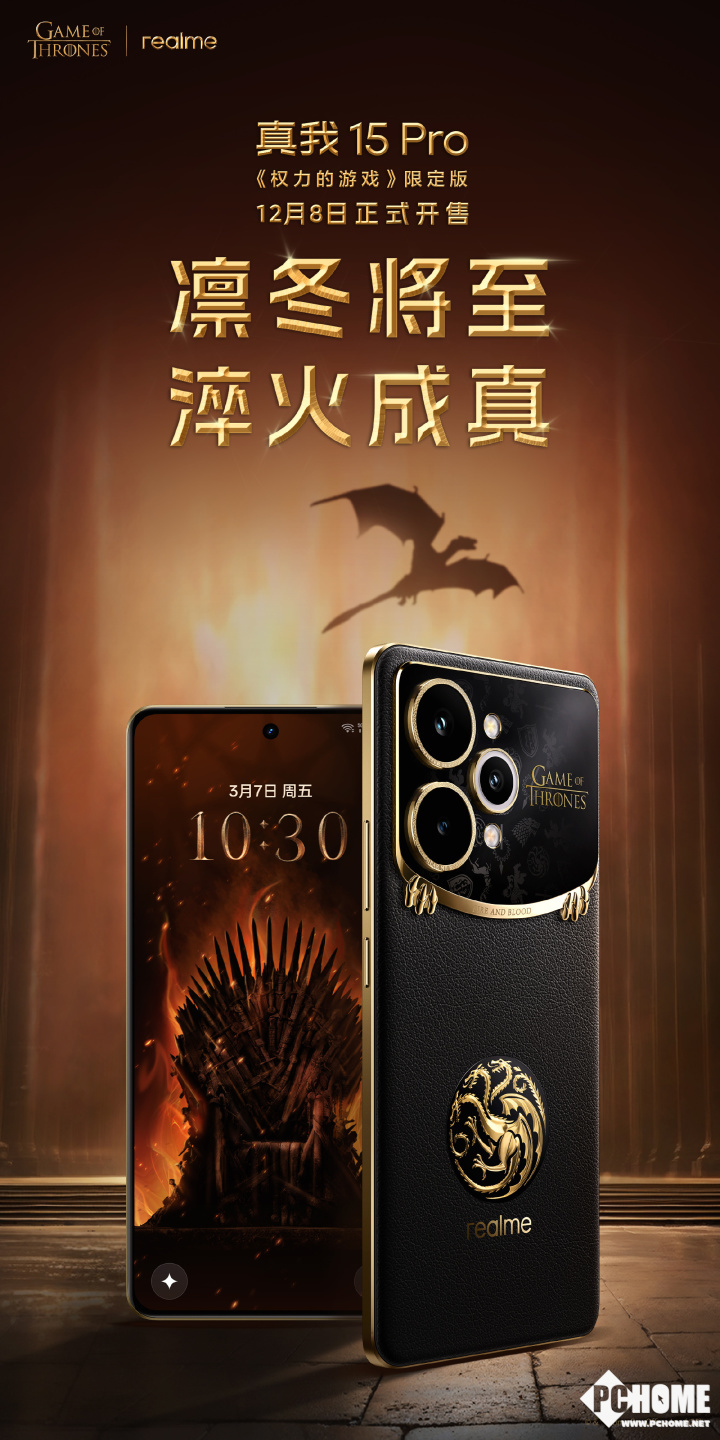 12月3日,真我realme副总裁、全球营销总裁、中国区总裁徐起发布微博,首曝真我15Pro《权力的游戏》限定版外观,并宣布于12月8日正式发售。