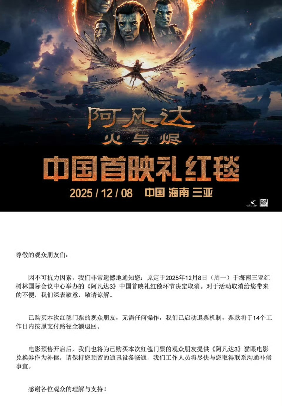 《阿凡达3》表示:因不可抗因素,原定于2025年12月8日于海南三亚红树林国际会议中心举办的《阿凡达3》中国首映礼红毯环节决定取消,对此给观众带来的不便深表歉意。
