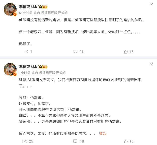 2025年12月3日,前魅族科技高级副总裁、Angry Miao创始人李楠在社交媒体平台发文称,已根据目前销售数据评论进行了AI眼镜调研。
