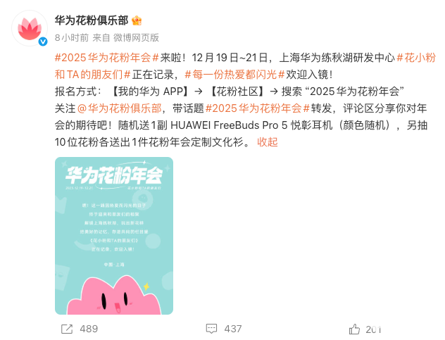 2025年12月3日,华为花粉俱乐部官宣,2025华为花粉年会将于12月19日-21日在上海华为练秋湖研发中心举办。