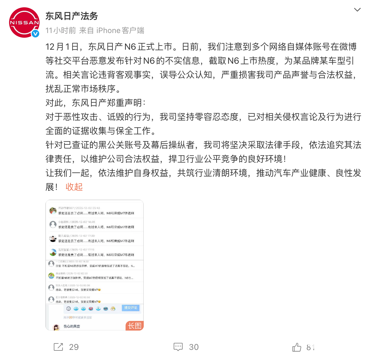 2025年12月3日,东风日产法务部在社交媒体平台发布声明称,自12月1日东风日产N6正式上市以来,多个网络自媒体账号在微博等社交平台恶意发布针对该车型的不实信息,借N6上市热度为其他品牌车型引流。这些言论违背客观事实,不仅误导公众认知,更严重损害东风日产产品声誉与合法权益,扰乱正常市场秩序。