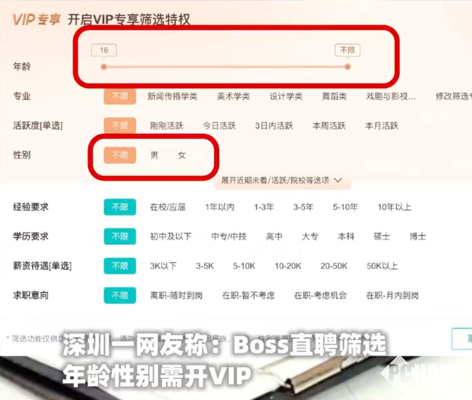 BOSS直聘客服回应称,“年龄,性别目前确实是属于VIP专享的一个特权,如果想要合适的求职者,可以尝试多点一下不合适和收藏,这样系统也会优化推荐的。”