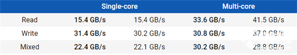 在单核性能方面,DDR5的内存读取没比DDR4有什么变化,发挥不了高频率的优势,不过多核性能上,DDR4的读取、写入高了20%左右,仅在混合读写上略输DDR5一些。