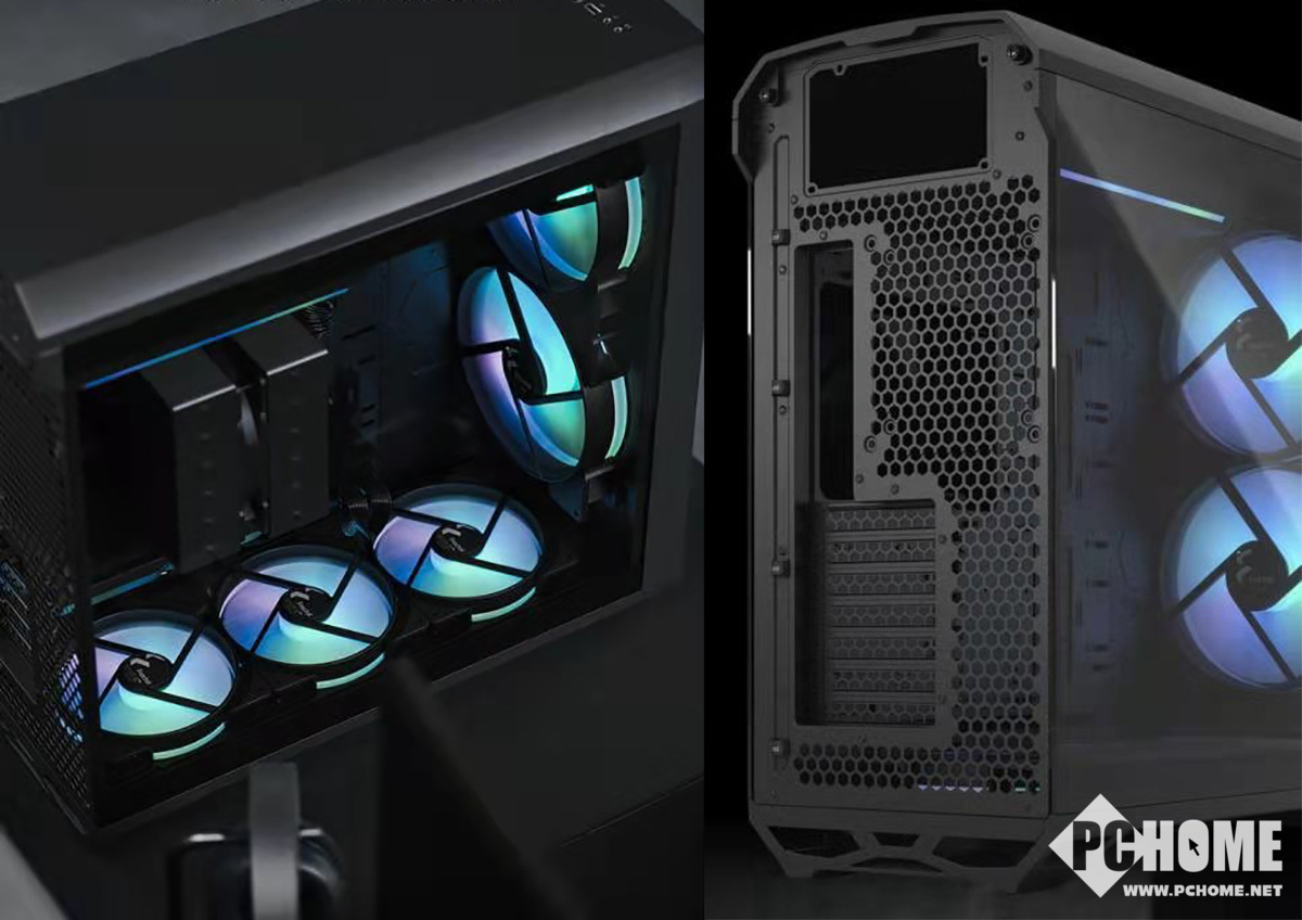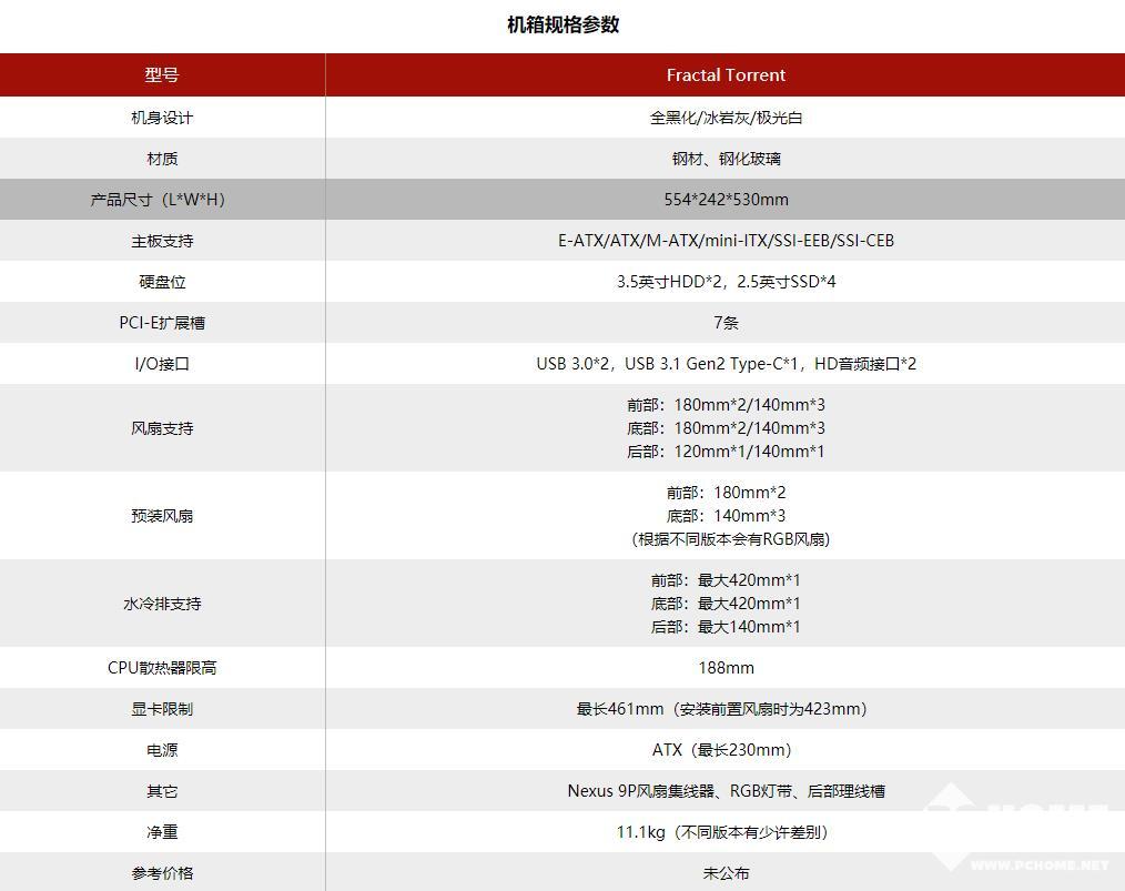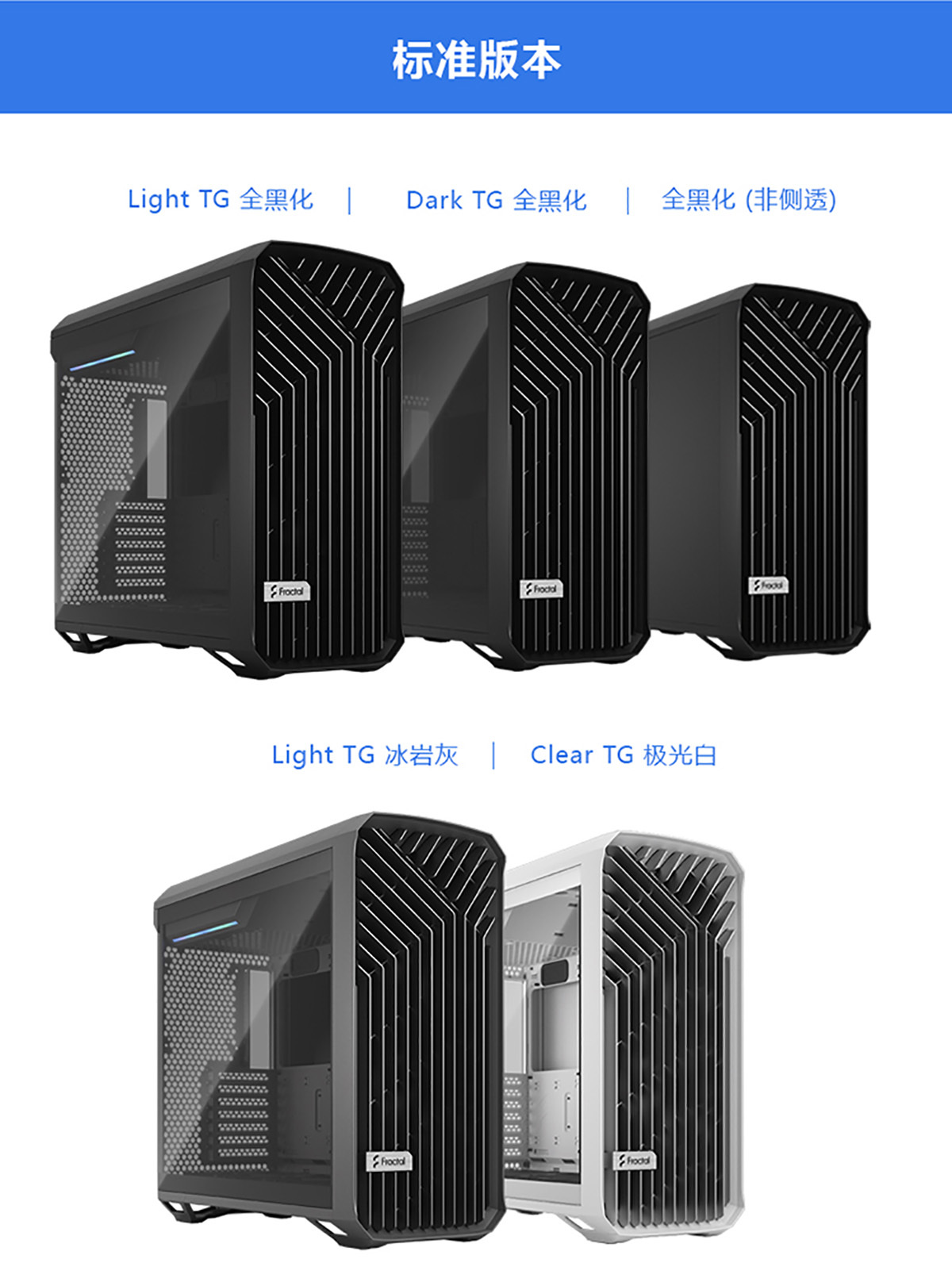 最后 Fractal Torrent机箱提供了全黑化/冰岩灰/极光白三种配色选择,全黑化版本可选浅黑钢化侧透、深黑钢化侧透以及密封钢材侧板,全系列均标配了前两个180mm,加上底部三个140mm风扇,而且按照不同定位的版本,所标配的风扇还会有RGB版本。