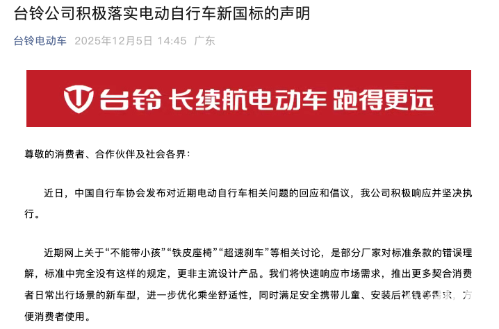 12月5日,台铃科技股份有限公司发布声明,明确表示将积极响应新国标要求,通过技术升级与产品创新,推出契合消费者日常出行场景的合规车型。