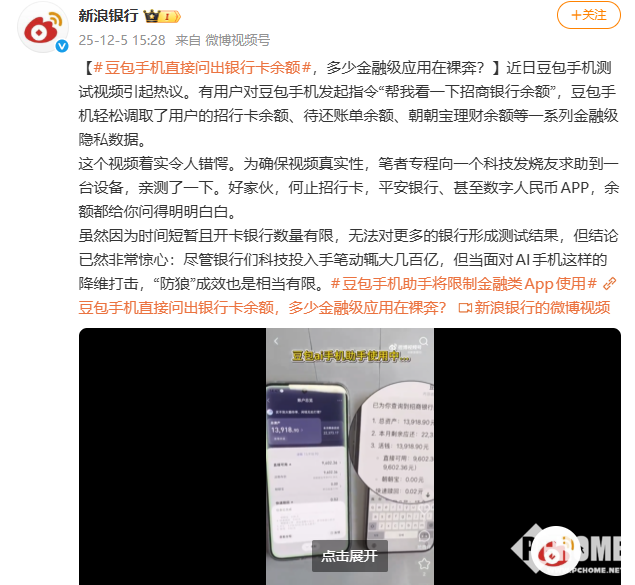 2025年12月5日消息,豆包手机助手成为引发网络热议,但“能力失控”“用户隐私”等争议也接踵而至。据新浪银行,有网友反映,在向豆包手机助手发出“帮我查看招行银行余额”指令后,豆包手机助手直接读取招商银行APP,不仅显示出银行卡余额,还有待还账单余额、朝朝宝理财余额等信息,全程用户未输入任何密码。