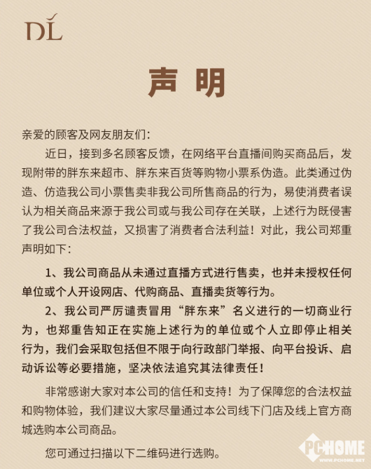 近日,许昌市胖东来商贸集团有限公司发布声明称,近期接到消费者反馈,有网络平台直播间售卖商品时附带伪造的胖东来超市、百货购物小票,借此误导消费者认为商品与胖东来有关。