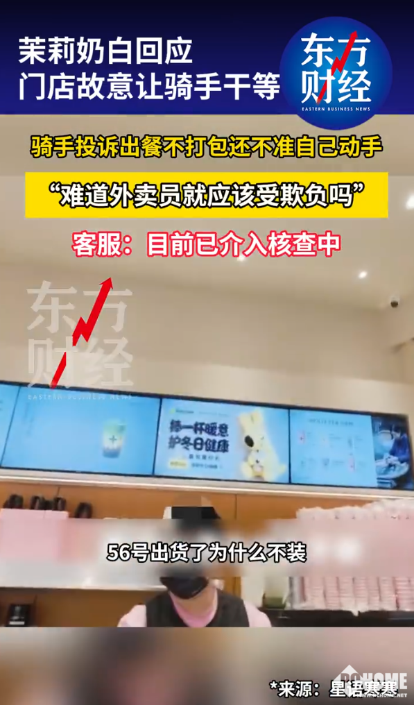 2025年12月8日,据东方财经报道,茉莉奶白商家点出餐后不打包故意让骑手等,骑手要动手自己包被店员制止,态度恶劣。