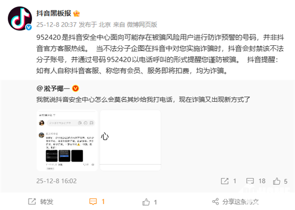 12月8日,近期多位网友在社交平台发帖称,接到显示为“抖音安全中心”的952420来电,怀疑是新型诈骗手段。8日,抖音官方通过“抖音黑板报”回应,明确该号码为平台防诈预警专用号,并非官方客服热线。
