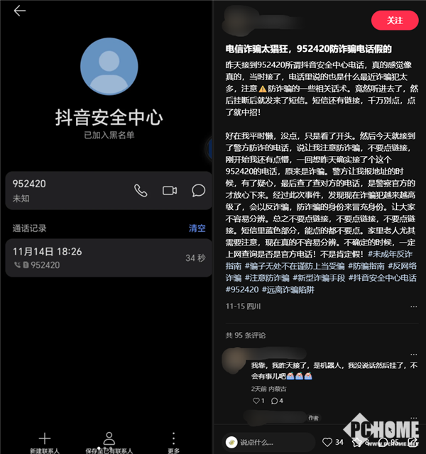 12月8日,近期多位网友在社交平台发帖称,接到显示为“抖音安全中心”的952420来电,怀疑是新型诈骗手段。