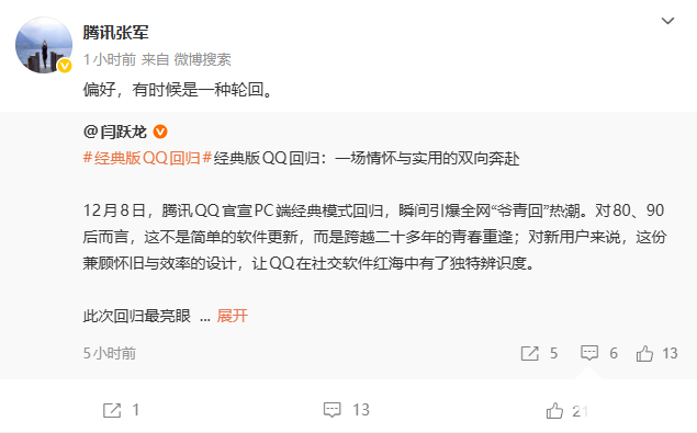 2025年12月9日,腾讯公司公关总监张军发布博文回应经典版QQ回归:偏好,有时候是一种轮回。