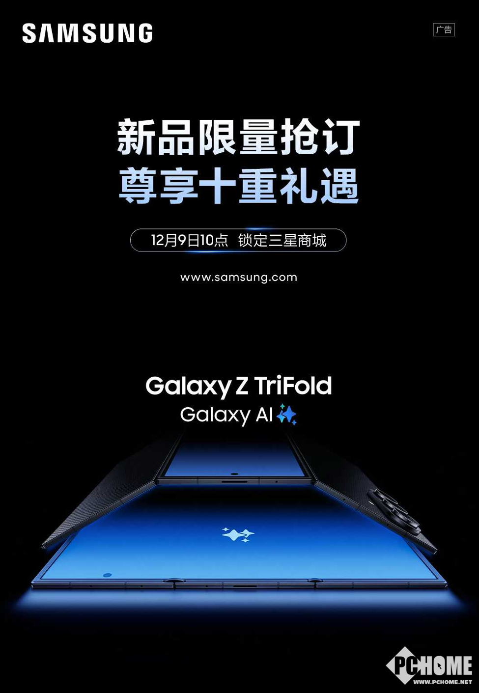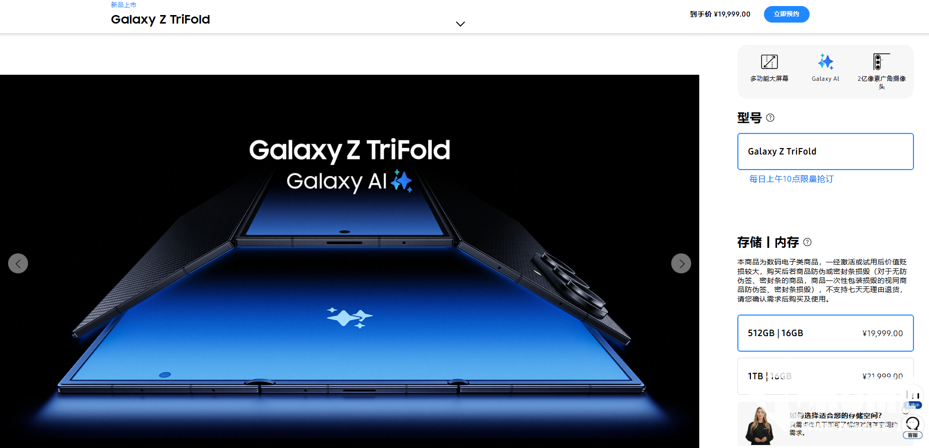 2025年12月9日消息,三星首款三折叠Galaxy Z TriFold正式开启预售,即日起每日上午10点,在三星官方商城“新品限量抢订”,Galaxy Z TriFold售价为19999元(16GB+512GB)和21999元(16GB+1TB),与华为三折叠手机HUAWEI Mate XT非凡大师起售价相同。