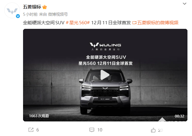 2025年12月9日,五菱银标官方发布博文,全能硬派大空间SUV星光560将于12月11日全球首发。