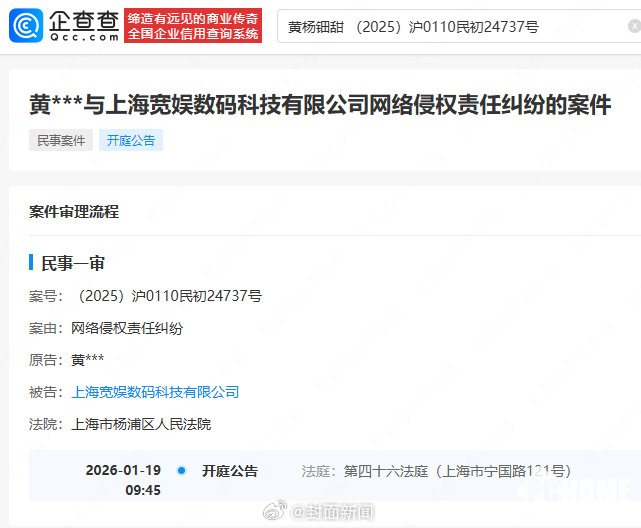 2025年12月9日,据封面新闻报道,近日,法院公开黄杨钿甜起诉上海宽娱数码科技有限公司网络侵权责任纠纷的案件信息,据悉,相关案件计划将于2026年1月19日开庭审理。