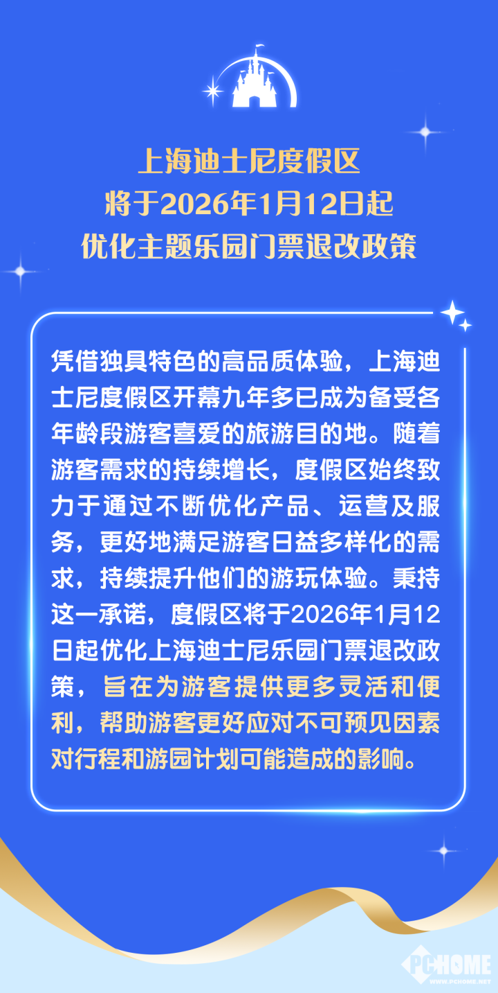 2025年12月10日,上海迪士尼度假区官微发布消息称,将于2026年1月12日起优化主题乐园门票退改政策。