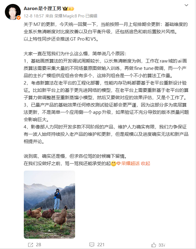 2025年12月10日消息,12月8日荣耀影像系统专家“Aaron是个理工男”发布微博,统一回复了关于Magic7系列影像更新的问题。