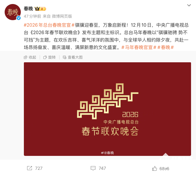 2025年12月10日,中央广播电视总台《2026年春节联欢晚会》发布主题和主标识。