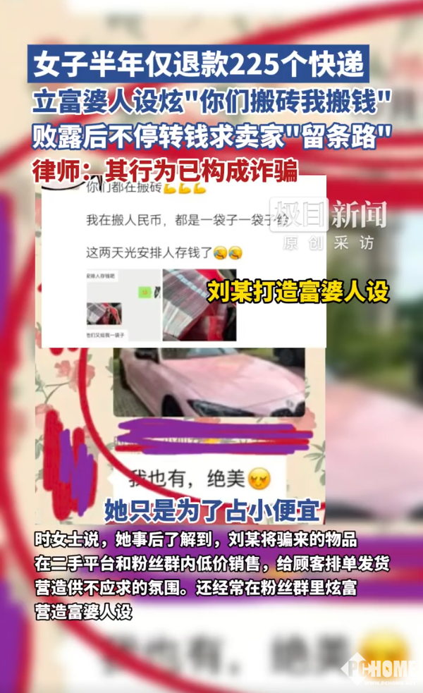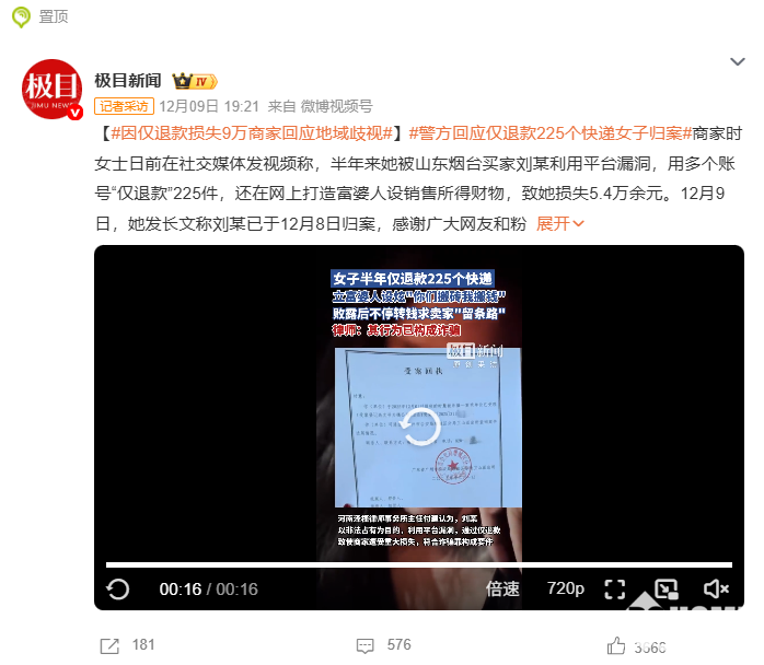 2025年12月10日消息,于昨日,据极目新闻报道,商家时女士日前在社交媒体发视频称,半年来她被山东烟台买家刘某利用平台漏洞,用多个账号“仅退款”225件,还在网上打造富婆人设销售所得财物,致她损失5.4万余元,刘某已于12月8日归案。