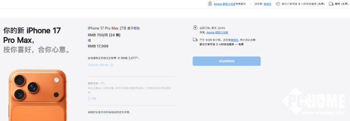 据苹果官方网站显示,例如,在北京市朝阳区,通过苹果在线商店购买一部iPhone 17 Pro Max可选择“3小时快送服务”或者“到店取货”,官方要求下午4:00前完成订购。据了解,对于现货商品,iPhone, iPad、Apple Watch、Macbook Pro、Macbook Air、AirPods等产品可免费配送,其余产品需支付45元运费,“快送服务”时间为每日上午10:00至下午8:30,具体以结账页面信息为准。