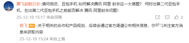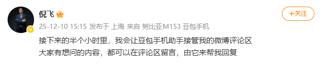 2025年12月10日消息,中兴通讯终端事业部、努比亚总裁倪飞在社交媒体发文称,“接下来的半个小时里,我会让豆包手机助手接管我的微博评论区,大家在评论区留言,由它来帮我回复”。随后,网友纷纷发出提问,倪飞的社交媒体评论区活跃起来。