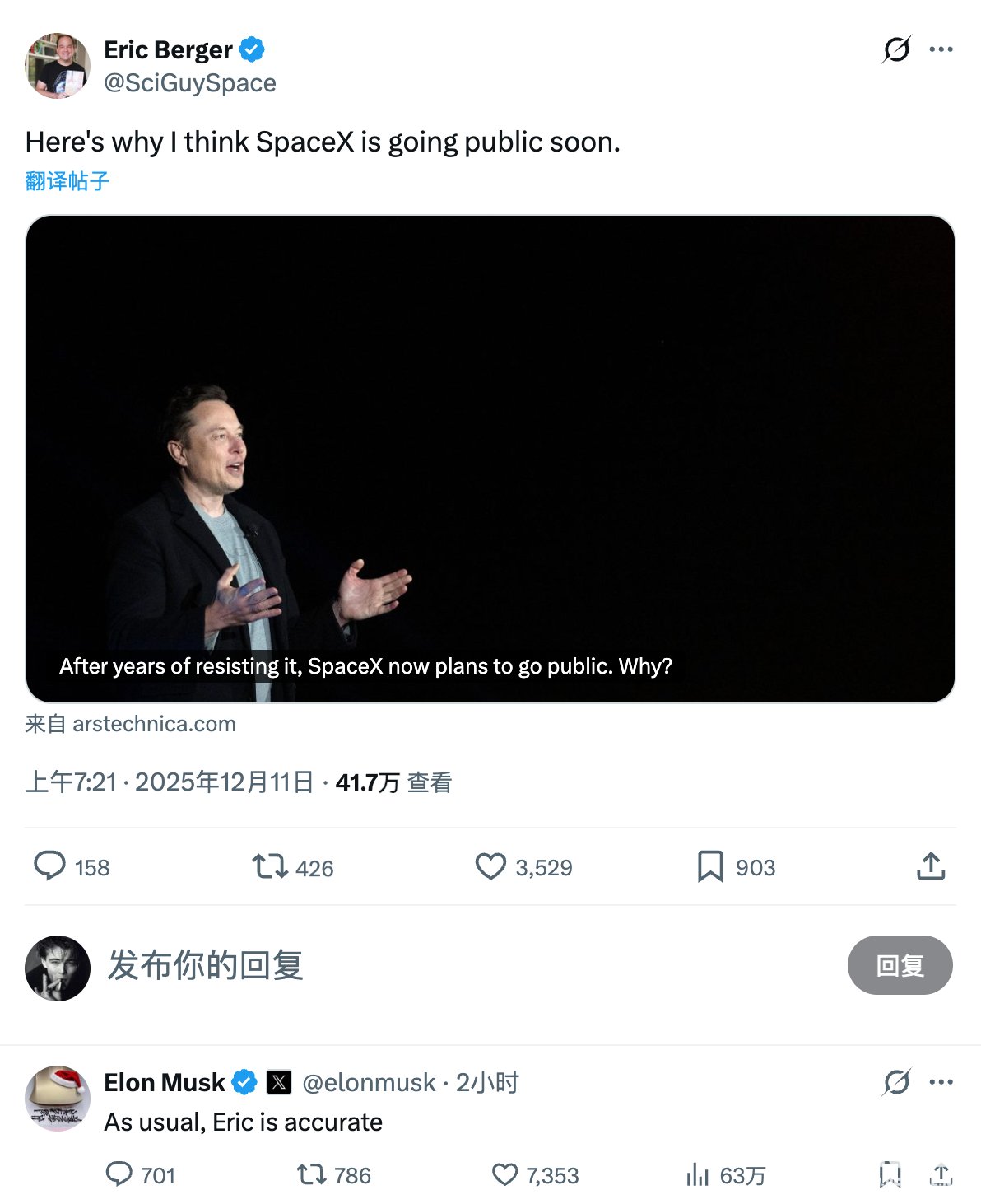 12月11日,在社交媒体平台,博主Eric Berger分享有关Space X即将上市的消息,马斯克现身评论区回应称“As usual, Eric is accurate(和往常一样,埃里克的判断很准确)”,侧面确认了SpaceX的IPO传闻。