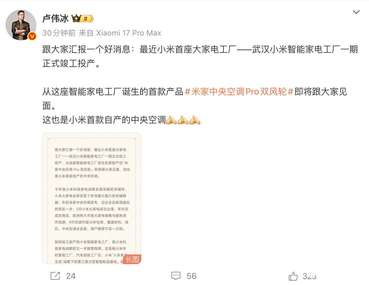小米集团合伙人、总裁,手机部总裁,小米品牌总经理卢伟冰发文称,小米首座大家电工厂——武汉智能家电工厂一期正式竣工投产,其首款自研产品“米家中央空调Pro双风轮”同步官宣,这也是小米首款自产中央空调产品。