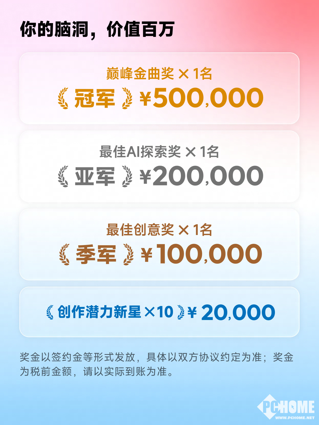 据了解,本次大赛奖金力度为目前国内AI音乐赛事领域之最,冠亚季军奖金分别达50万元、20万元、10万元。与此同时,为鼓励优质AI歌曲的创作,网易云音乐平台也已全新上线AI歌曲激励金活动,平台入驻音乐人均可参与。