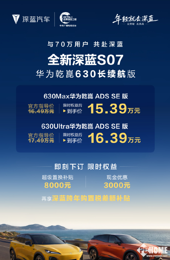 2025年12月11日,深蓝汽车官方微博宣布,全新深蓝S07华为乾崑630长续航版于今日全球上市,限时权益后到手价15.39万元起。