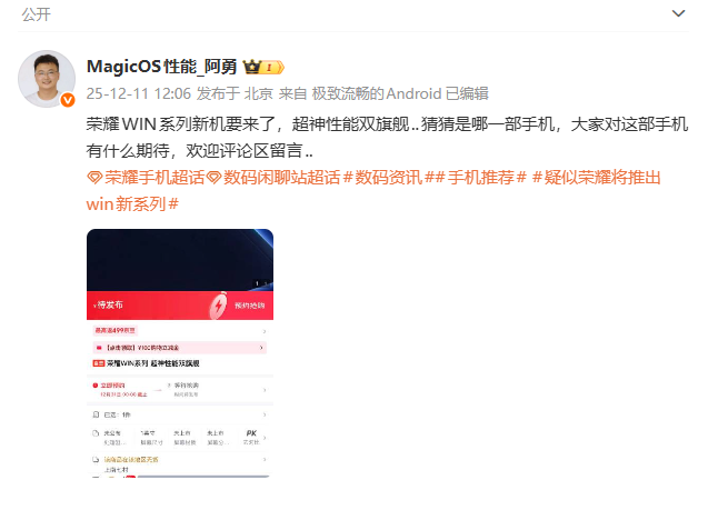 2025年12月11日,荣耀性能优化研发工程师MagicOS性能_阿勇发布博文称,荣耀WIN系列新机要来了,超神性能双旗舰..猜猜是哪一部手机,大家对这部手机有什么期待,欢迎评论区留言。