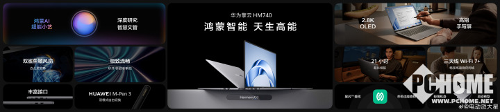 屏幕方面,华为擎云HM740搭载的2.8K旗舰OLED屏,兼具120Hz高刷新率、广色域与高亮度,还自带专业护眼功能并兼容HUAWEI M-Pen 3。续航方面,华为擎云HM740搭载70Wh大容量电池,可实现21小时1080P本地视频播放或15小时语音会议。生态方面,鸿蒙电脑应用已从2000多发展至12000以上,生态丰富度实现跨越式增长。