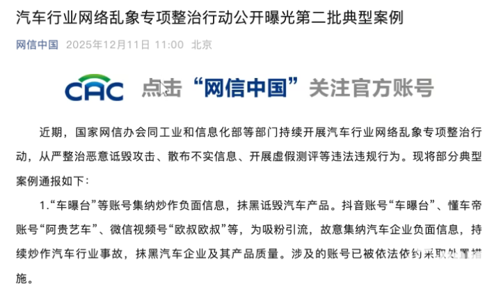 据了解,国家网信办会同工信部等六部门自2025年9月起持续开展汽车行业网络乱象专项整治行动,聚焦恶意诋毁攻击、散布不实信息、虚假测评、非法牟利等核心乱象,包括黑公关、网络水军炒作负面、AI造虚假内容等行为。行动通过企业自查、畅通举报、线索研判等方式推进,对违规账号依法依约处置并曝光典型案例。截至12月11日,已通报多批案例,处置“车曝台”等大量违规账号,清理不良信息,有力遏制行业网络乱象,为汽车产业高质量发展筑牢网络生态屏障,维护市场公平与消费者权益。