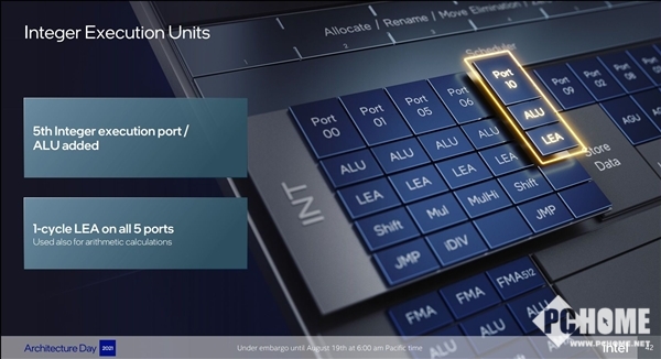 整数执行引擎部分,增加了第五个整数执行端口,所有五个端口都可以执行ALU、LEA,理论上就原生ALU吞吐能力而言是最宽的x86内核。