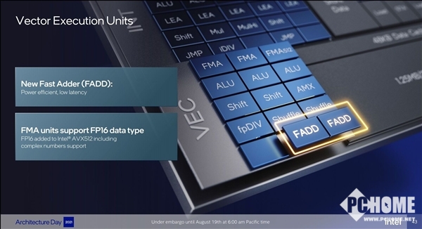 矢量执行引擎部分,增加了新的快速加法器(FADD),比传统FMA单元效率更高、延迟更低,FMA单元则增加支持FP16浮点数据类型,属于AVX-512指令集的一部分。