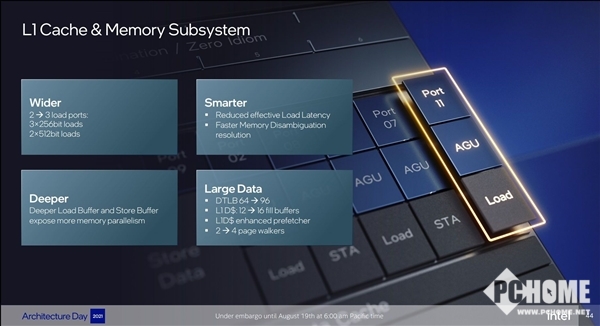 载入和存储部分,通过载入AGU增加了一个专用的执行端口,这样载入端口从2个增至3个,同时载入缓冲和存储缓冲更深,载入延迟更低,而针对当今负载不断增加的内存级并行需求,数据处理能力也大大增加。
