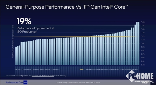 Intel宣称,Golden Cove架构相比于现在11代酷睿桌面上的Cypress Cove,实现了平均大约19%的IPC(每时钟周期指令数)提升,可以理解为同频性能的提升幅度。