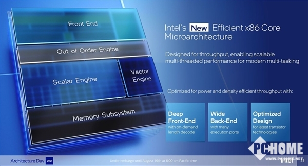 架构方面,小核心就相对简单不少了,但变化也非常大,比如指令缓存增大至64KB,可在不耗费内存子系统功率的情况下保存可用指令,还有Intel的第一个按需指令长度解码器,可生成预解码信息,加速现代工作负载。