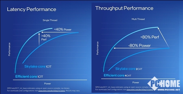 Intel表示,这种小核心设计可以在有限的芯片空间内,实现多核任务负载,并具备宽泛的频率范围,降低整体消耗,为更高频率运行提供果功耗和散热空间,满足更多动态任务负载。